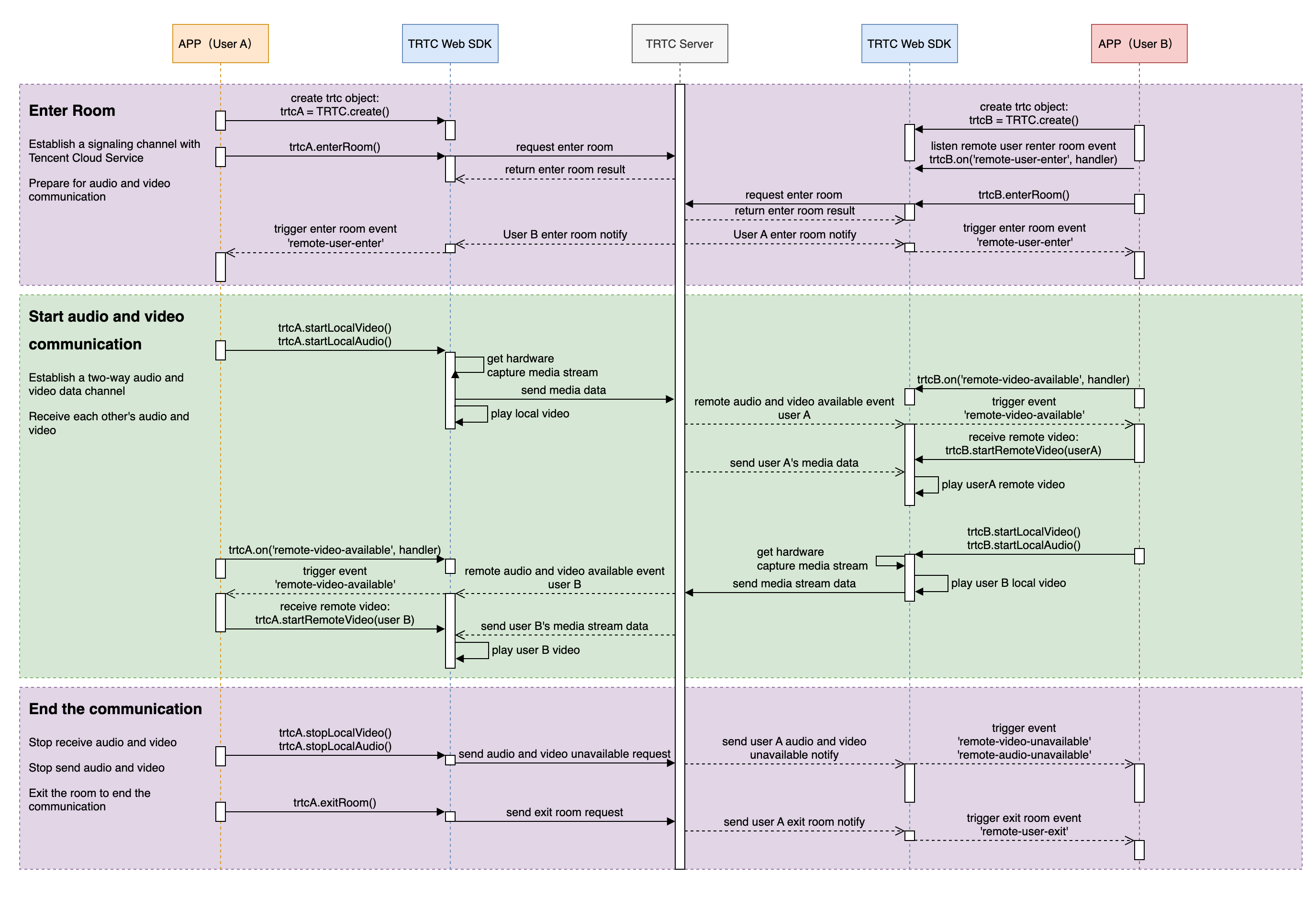 The following figure shows the basic API call process for implementing audio and video communication:
