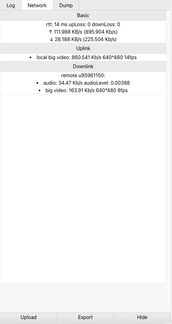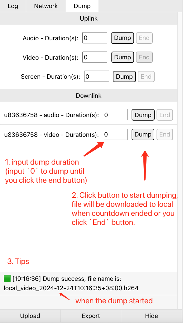 - Dump video: Dump the local upstream video stream or remote downstream video stream into a