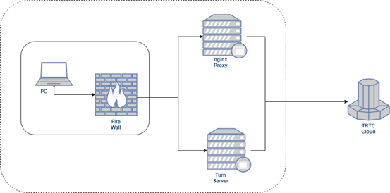 The TRTC Web SDK uses UDP to communicate with the TRTC server by default, and has a built-in Turn Server that supports relaying media data through UDP or TCP. In the public network, users do not need to set up any proxies, as the SDK will attempt to establish media connections in the order of direct connection, Turn Server UDP, and Turn Server TCP. If it is known that the user will be using the SDK within an internal network firewall, it may not be possible to establish a media connection, and a proxy will need to be set up.