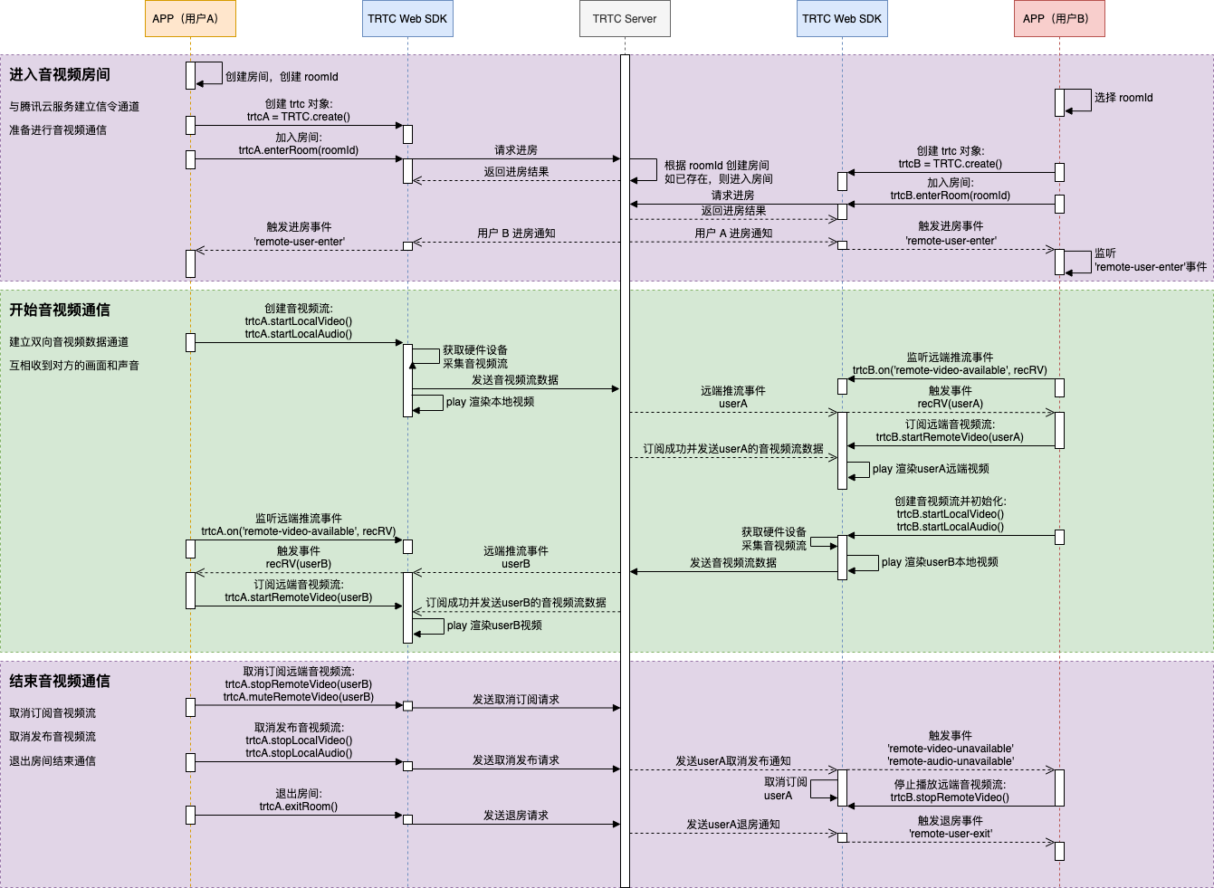 - 为了保证通话体验,建议在正式开始音视频通话前,进行设备检测和浏览器兼容性检测,可以参考文档浏览器兼容信息,通话前环境与设备检测。