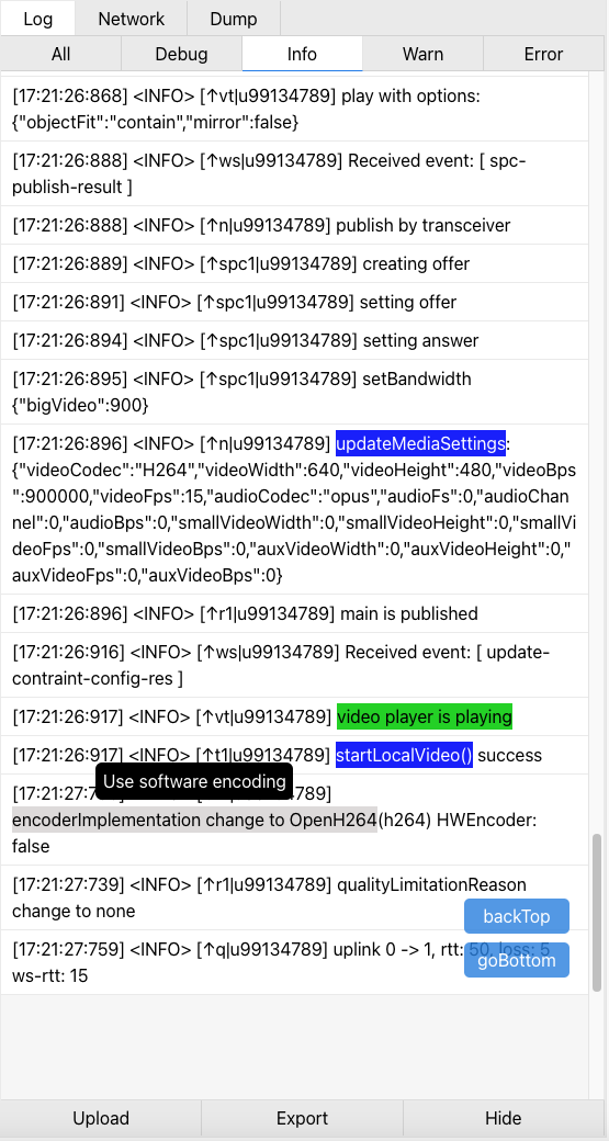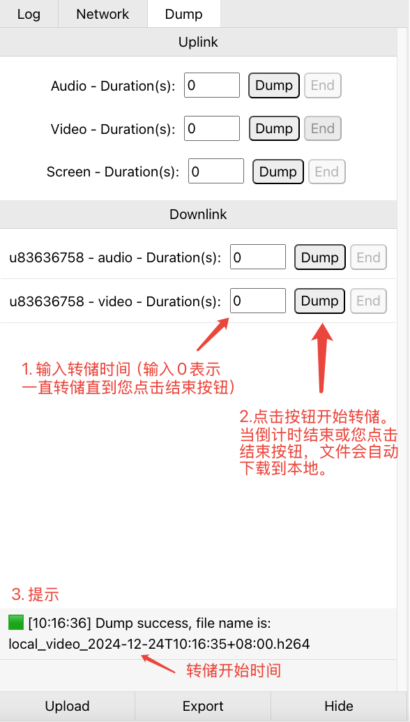 - 转储视频: 将本地上行的视频流或远端下行的视频流转储为