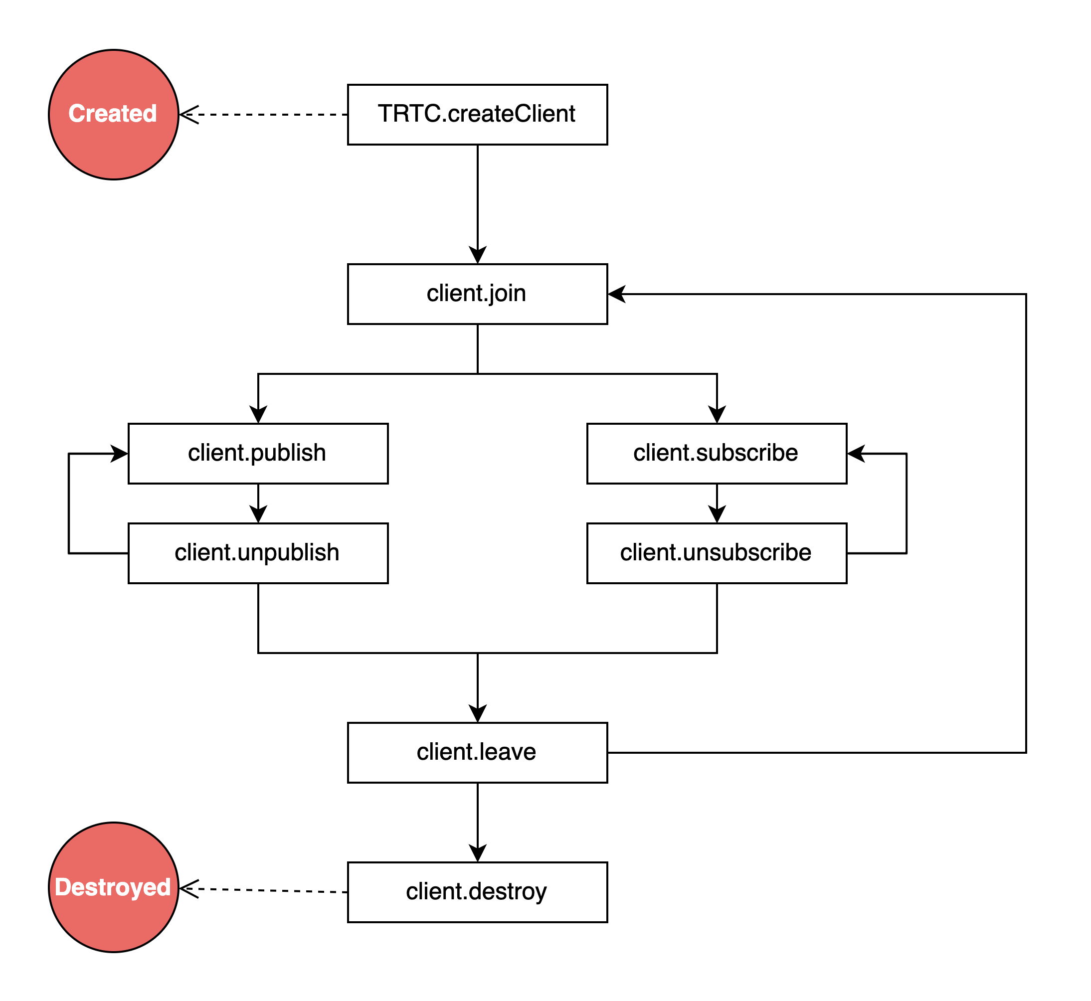 - 已进房的情况下,需先调用 client.leave 接口退房成功后,才能调用该接口销毁 client。