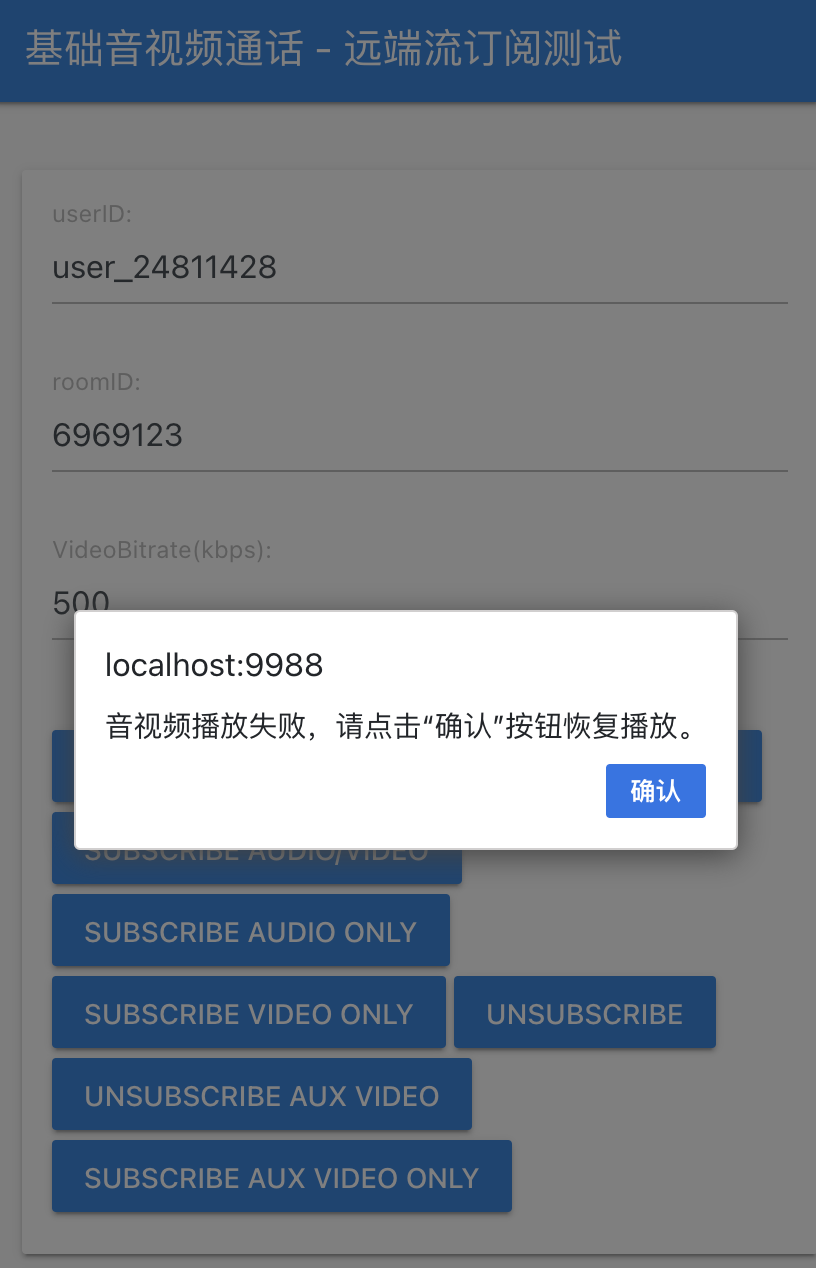 例如:在 iOS 微信浏览器及其小程序的 webview 中,页面首次播放远端流时,必须在用户点击事件的回调函数中调用播放接口,否则播放会失败。倘若您在用户点击事件的回调中,使用了 setTimeout 等接口来异步调用播放接口,亦会出现自动播放失败错误。